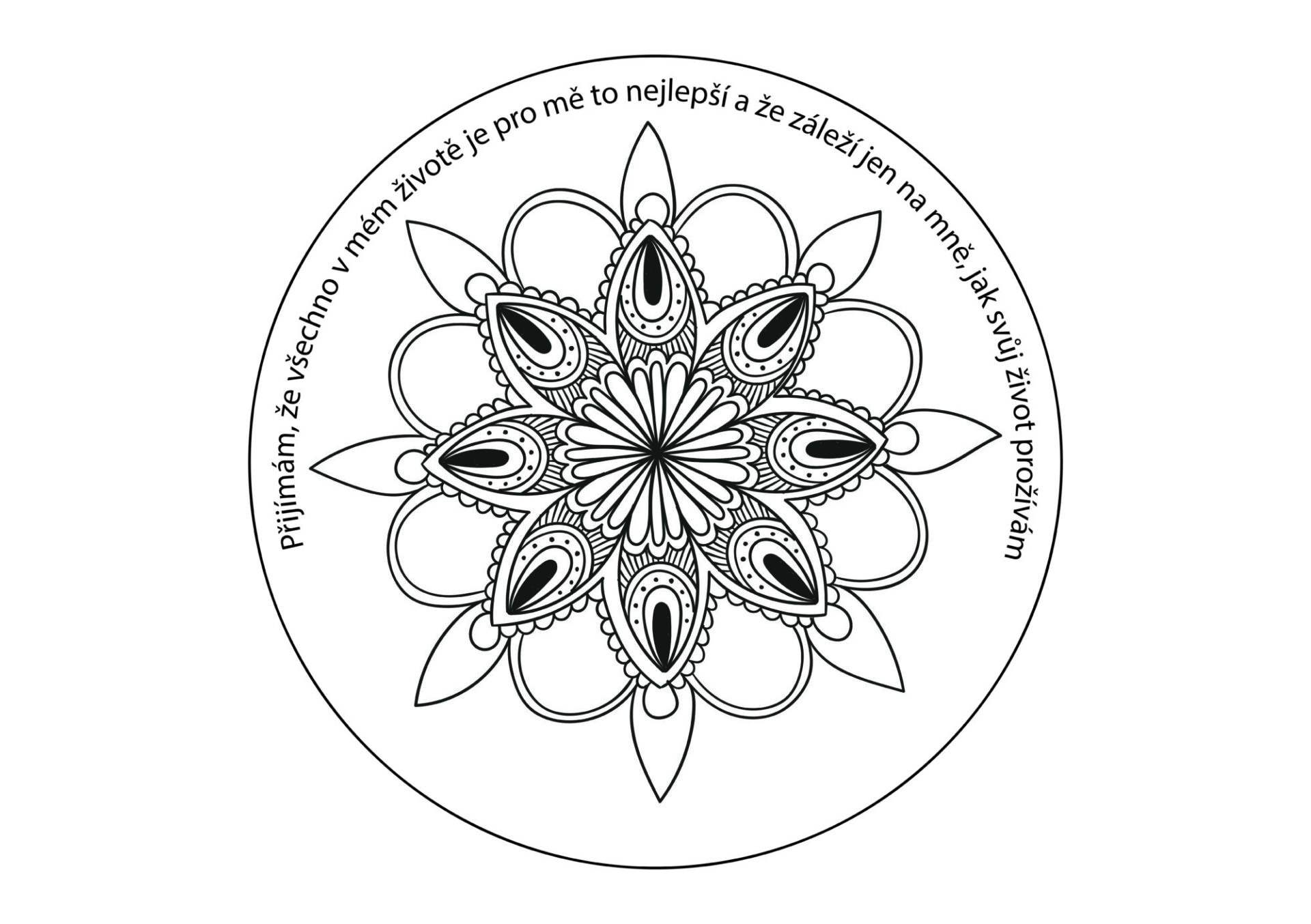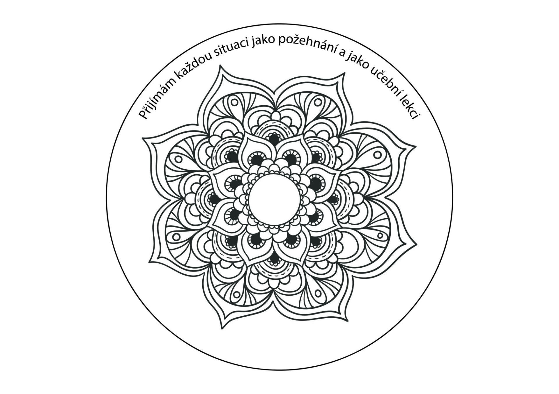 Mandal je 9, jako týdnů období, nejvhodnějšího pro trénování přijetí všeho, co v životě k tobě přichází. Každý týden vymaluj jednu vědomě s tím, že si při vybarvování uvědomuj text na mandale, protože právě o tom textu ta mandala je.